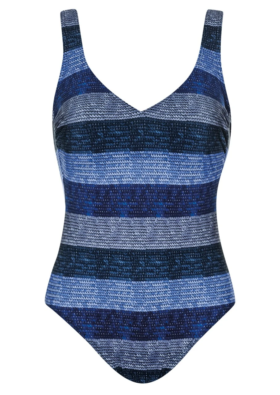 Kräftige Querstreifen in verschiedenen Blautönen in Kombination mit zierlichem Druck von aufgereihten Pailletten ergeben eine ganz junge und frische Optik. Bequemer Badeanzug mit Softschalen und V-Ausschnitt.