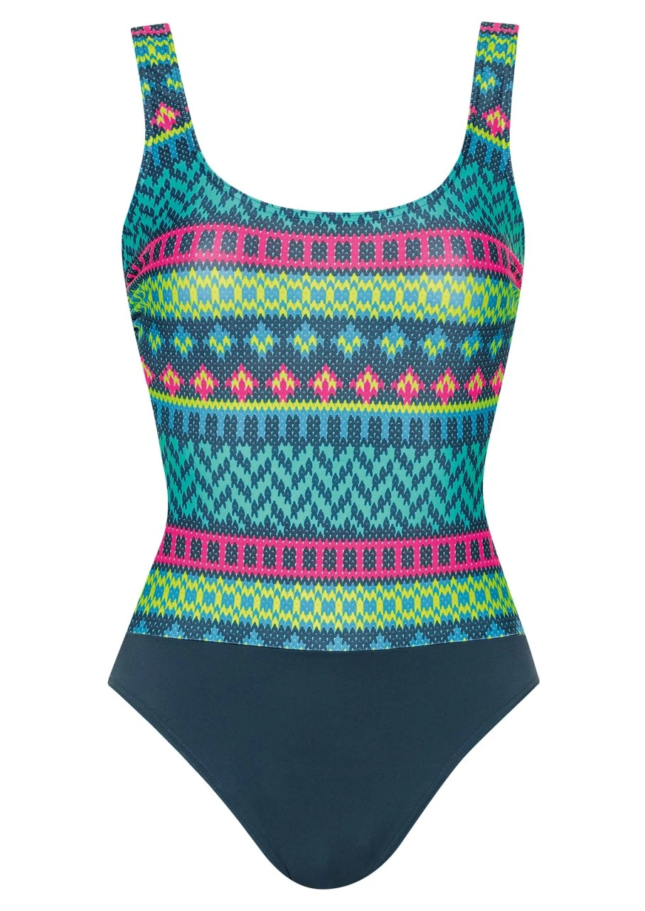 Multicolorful neu definiert. Die Anordnung an einem kräftigen Pink, dunklen Blau und zarten Rot und Grüntönen, gemixt mit einem außergewöhnlichen Muster. Badeanzug mit Softschalen.