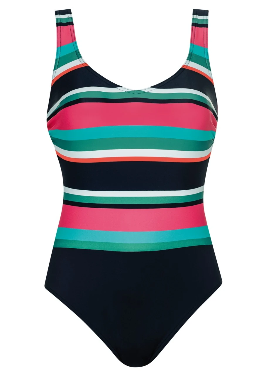 Knallige Farben! Frisches Design mit unterschiedlich breiten Querstreifen – so strahlend wie der Sommer. Badeanzug mit Softschalen und einem tiefen Rückenausschnitt.