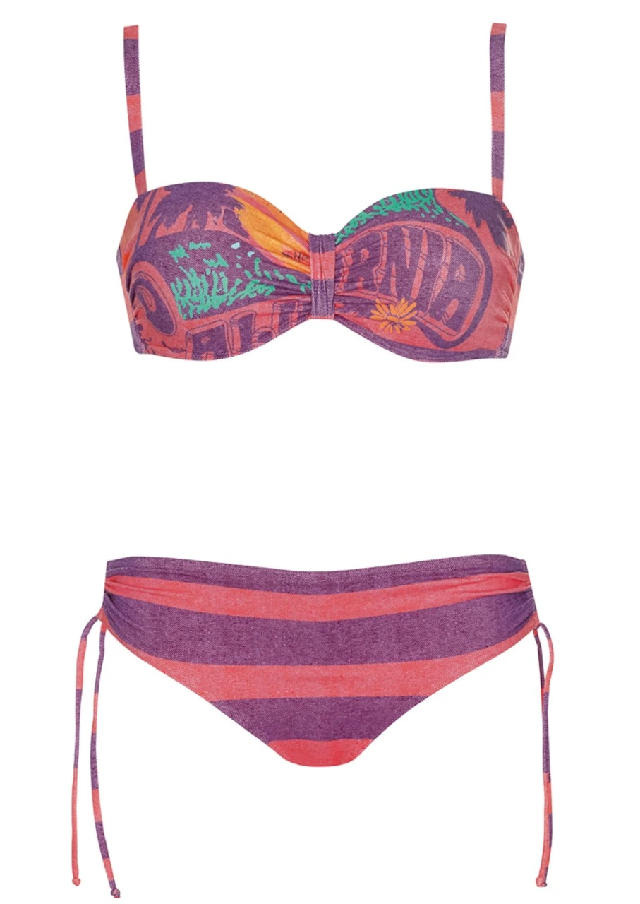 Sportliche Streifenoptik in Hellrot und Violett. Der Palmendruck mit Akzenten in Türkis und großen „CALIFORNIA“- Schriftzug gibt dem Design einen Frischekick. Verwendet wurde ein ganz weiches Material, das optisch an Baumwolle erinnert. Eine geniale Kombination. Bandeau-Bikini mit Softschalen und Formbügel. Die Träger sind verstellbar und abnehmbar. Verstellbarer Bikini-Slip – durch die Bändchen an den Seiten kann die Höhe der Bikinihose verstellt werden.