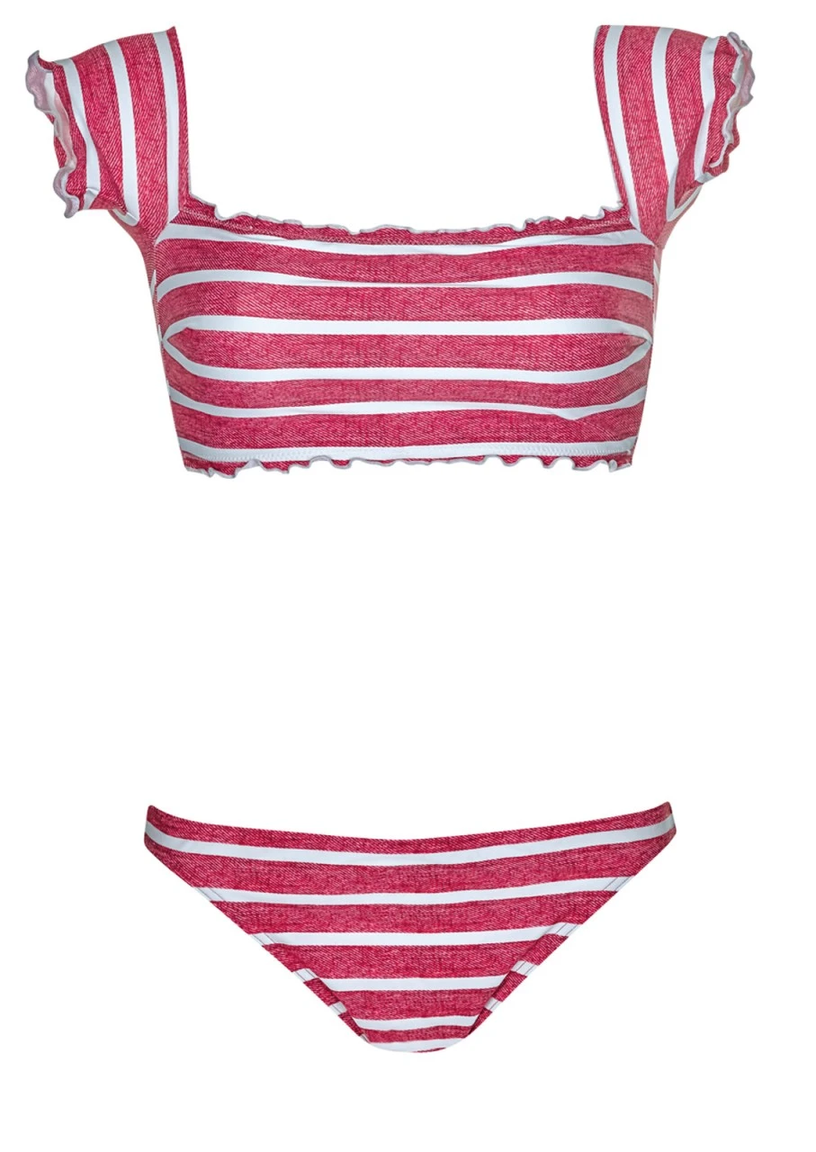 Querstreifen in Weiß und in sich gemustertem Rot – das ist das Design der Serie RED BLISS. Bikini im Bustier-Style und niedlichen Carmenärmel. Die Abschlüsse des Bikini-Tops sind leicht gerüscht. Ein eingearbeiteter Gummi gibt Halt. Die Hüfthose mit schmaler Seitenhöhe vervollständigt den niedlichen Zweiteiler.