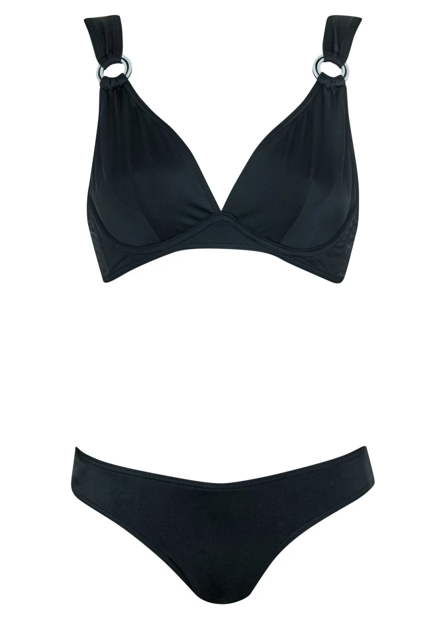 Ein Klassiker der Bademode: Schöner Bikini in Schwarz mit Formbügel und Petticoatstütze. Die bequemen, breiten Träger sind verstellbar, am Rücken aushakbar und mit einem Zierring in der Farbe Schwarz/Weiß versehen. Schmale Hüfthose.