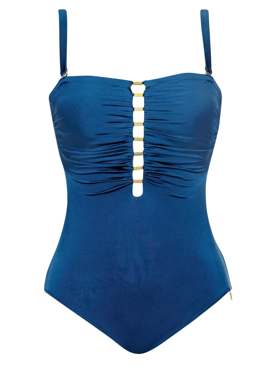 Exklusiver, unifarbener Bandeau-Badeanzug mit Softschalen. Die Träger sind verstellbar, aushakbar und abnehmbar. Ein wahrer Blickfang ist das tief ausgeschnittene Dekolleté, das mit goldfarbenen Hülsen verziert ist. Ein weiteres Highlight ist der hohe Rückenausschnitt, der sich mit einem Kordelzug in der Höhe verstellen lässt. Luxuriös glänzendes Material in Blau oder Orange.