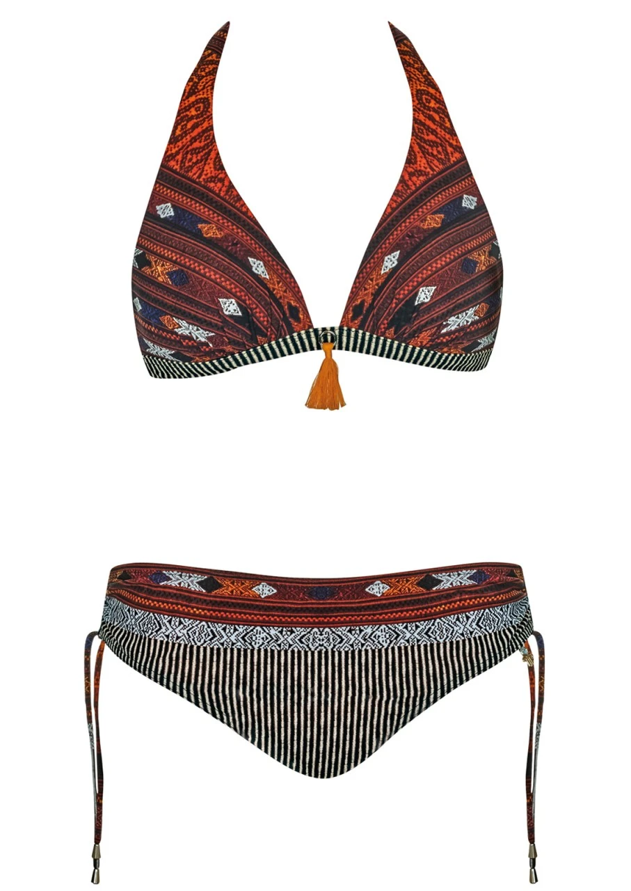 Atemberaubende Kombination aus Ethno-Anklängen und Nadelstreifen in den Farben eines goldenen Sonnenunterganges. Ein sehr stimmungsvolles Design. Triangel-Bikini mit Softschalen. Damit beim Liegen nichts stört, ist der Bikini am Rücken mit einem Verschluss zu schließen und im Nacken zu binden. Süßes Detail: Niedlicher Pompon in der Farbe Orange am Top. Der Slip lässt sich durch einen seitlichen Kordelzug in der Breite regulieren.