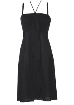 Ein Augenschmaus! Schulterfreies Kleid mit ausgeschnittenen Ärmeln in 3/4-Länge und V-Ausschnitt an Vorder- und Rückseite. Tolles Extra ist das schöne Zierteil in Kleiderfarbe. Das Kleid ist im Nacken zu binden.