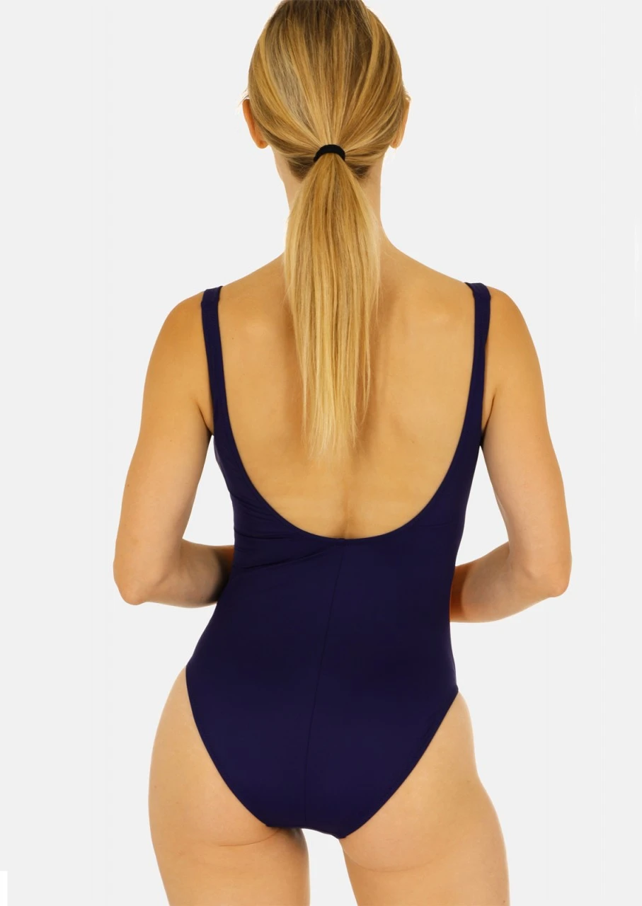Ein absoluter Blickfang! Schönes Nachtblau kombiniert mit leuchtendem Orange. Badeanzug mit eingearbeiteten Softschalen und Reißverschluss in der Farbe Weiß. Die Rückseite des Einteilers ist in der Farbe Nachtblau und hat einen tiefen Rückenausschnitt. Nachhaltige Bademode: OLYMPIA® GOES NEXT LEVEL – Bademode aus recyceltem Material.