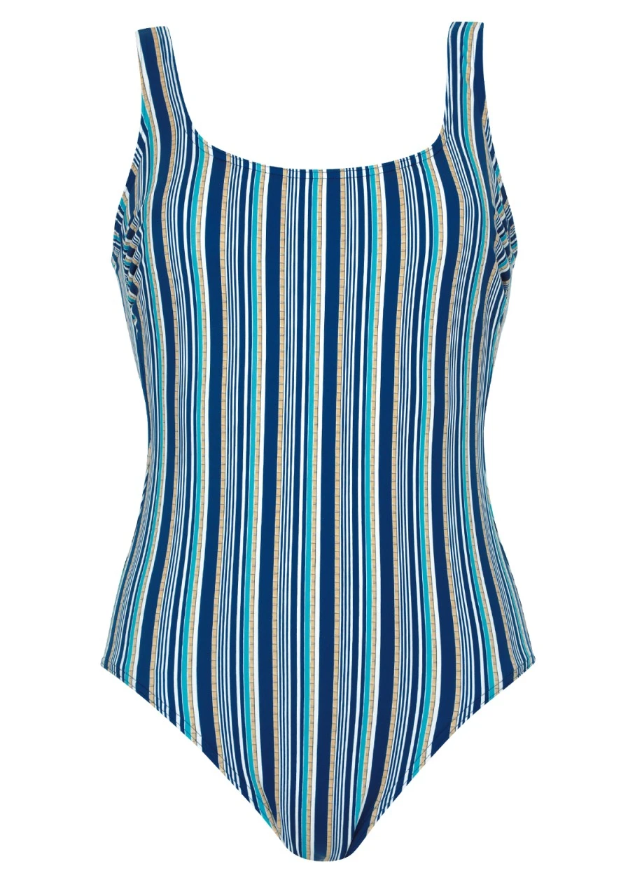 Es ist ganz einfach: Blaue, weiße, türkise und hellbraune Streifen in unterschiedlichen Stärken – so entsteht ein unkompliziertes, frisches Design. Badeanzug mit Softschalen und einem tiefen Rückenausschnitt. Damit der Badeanzug perfekt passt, sind die Träger in der Länge verstellbar. Nachhaltige Bademode: OLYMPIA® GOES NEXT LEVEL – das Polyamid für den Oberstoff ist zu 100 % aus recycelten Fasern.