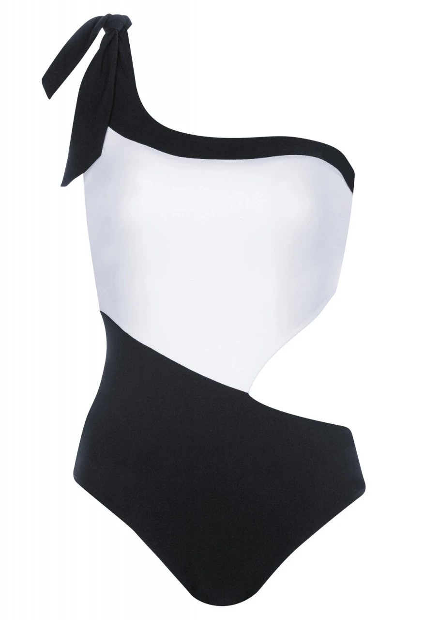 Es ist nur Schwarz und Weiß. Aber wie. Badeanzug mit geradem Ausschnitt, dramatischem Cut-Out auf der linken Seite und One Shoulder Träger. Der breite Träger ist mit einem Zierband versehen und verläuft diagonal über die Rückseite. Der hohe Rückenausschnitt bietet zusätzlichen Halt. Der Badeanzug ist mit Futter unterlegt. Ein spektakulärer, sehr sexy Badeanzug.