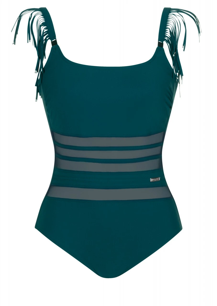 Modisch & elegant! Badeanzug mit Softschalen. Besonders Highlight sind die verführerischen Netzeinsätze im Bauchbereich. Der Zweiteiler wird mit zwei verschiedenen Schulterträgern geliefert: verstellbare sowie abnehmbare Standardträger und abnehmbare Träger mit lässigen Fransen. Somit bietet der Einteiler verschiedene Tragevarianten. Tiefer Rückenausschnitt. Erhältlich ist der Zweiteiler in edlem Schwarz und prachtvollem Dunkelgrün. Der Badeanzug ist komplett mit Futter unterlegt.