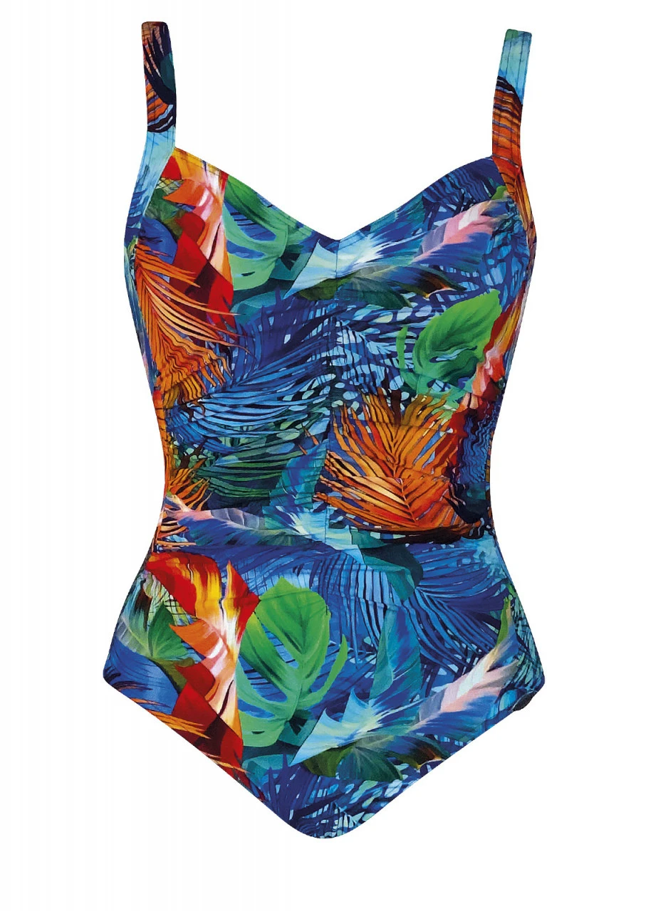 Einfach exotisch! Tropische Palmenblätter in den schönsten Farben auf einem blauen Leopardenmuster. Eine atemberaubende Optik in leuchtenden Farben! Badeanzug mit Softschalen und verstellbaren Trägern. Besonders trage- und figurfreundlich durch die leichten Raffungen an der Vorderseite. Der Einteiler ist komplett gefüttert. Durch diese Vollfütterung garantiert der Einteiler zusätzlichen Halt und ist besonders blickdicht. Tiefer Rückenausschnitt.