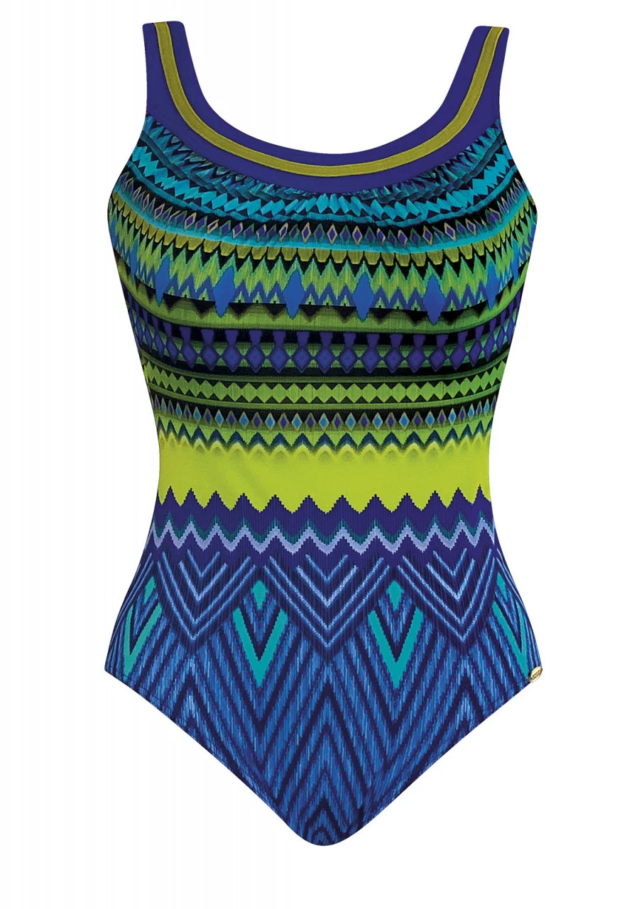 Überwältigende Farb-Pracht! Ornamentaler Print mit Ethno-Anklängen in kräftigen, leuchtenden Blau- und Grüntönen. Mastectomy-Badeanzug mit Softschalen und einem tiefen Rückenausschnitt. Das höher geschlossene Dekolleté sorgt für einen sicheren Sitz und der Brustansatz bleibt unsichtbar. Beidseitige Taschen ermöglichen das Einschieben der Prothesen und schützen sie vor Herausfallen. Die Träger sind verstellbar.