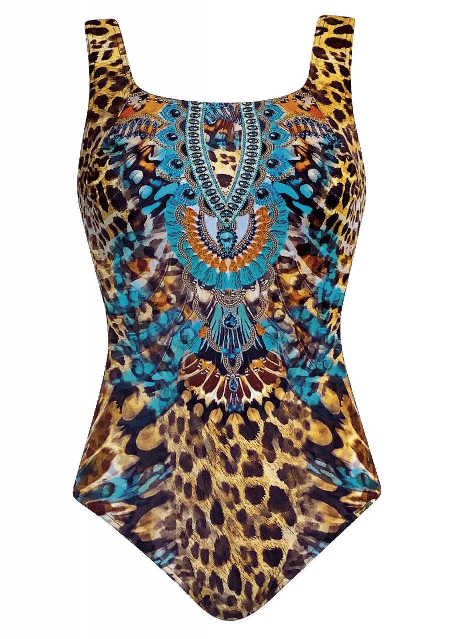 Leopardenmuster kombiniert mit Federn, Schmucksteinen und üppigem Ketten. Ein atemberaubend schöner Druck. Mastectomy-Badeanzug mit Softschalen und einem tiefen Rückenausschnitt. Die Träger sind verstellbar. Das höher geschlossene Dekolleté sorgt für einen sicheren Sitz und der Brustansatz bleibt unsichtbar. Beidseitige Taschen ermöglichen das Einschieben der Prothesen und schützen sie vor Herausfallen.