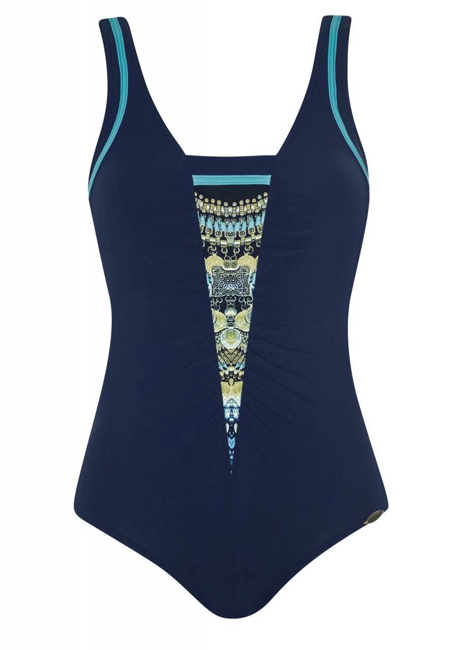 Shapewear-Badeanzug mit Petticoatstütze. Toller Figurschmeichler! Der Einteiler in der Farbe Blau ist mittig im Vorderteil leicht gerafft und mit einem gemusterten Einsatz versehen. Genialer Badeanzug aus einer besonders festen Stoffqualität. Formt sanft den Körper und unterstützt die Figur – auch dank des raffinierten Dessins. Tiefer Rückenausschnitt.