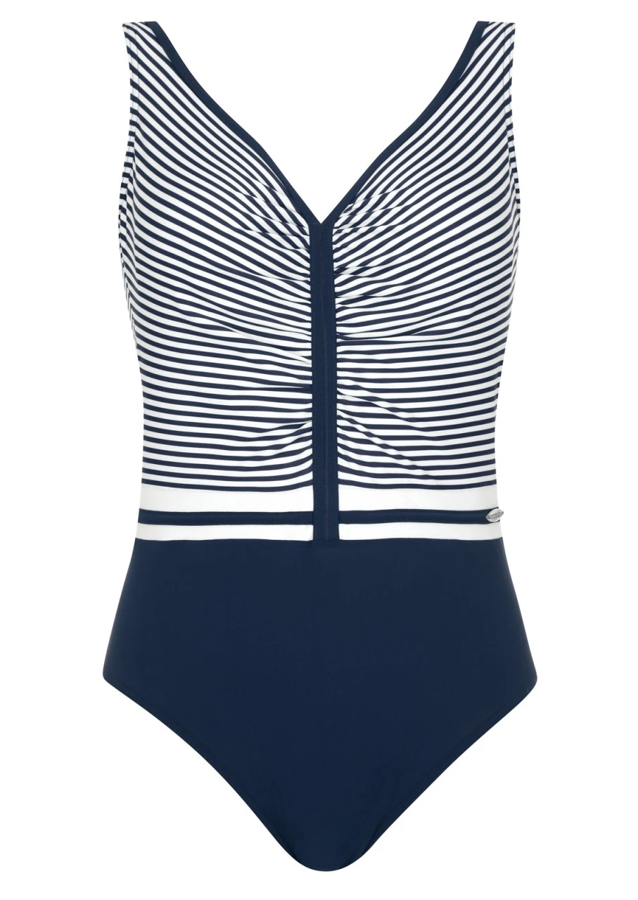 Schiff ahoi! Klassisches maritimes Design mit blau/weißen Streifen. Immer aktuell, immer schön! Badeanzug mit Softschalen und einem tiefen Rückenausschnitt. Die Träger sind verstellbar. Ein zauberhafter Badeanzug, im oberen Teil bedruckt, im unteren Bereich Uni Nachtblau. Besonders trage- und figurfreundlich durch die leichten Raffungen und die angebrachten Zierblenden. Nachhaltige Bademode: Das Polyamid für den Oberstoff ist zu 100 % aus recycelten Fasern.