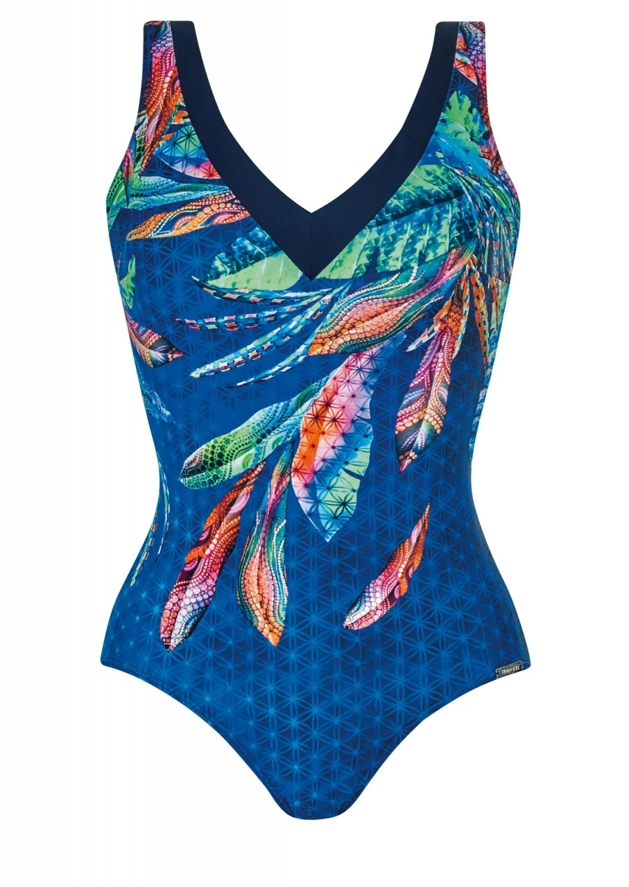 Ein federleichtes Design! Hinreißender Feder-Print in satten Farben auf einem leuchtenden blauen, in sich gemusterten Hintergrund. Badeanzug mit Softschalen. Der vordere Bereich des Badeanzuges ist mit einem besonderen Material gefüttert, das höchsten Tragekomfort verspricht. Diese Halbcorsage rückt die Figur mit dezent stützender und formender Funktion ins rechte Licht. Der V-Ausschnitt und der tiefe Rückenausschnitt sind mit einer blauen Blende versehen.