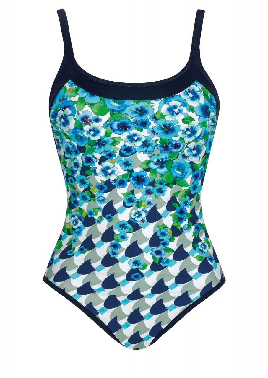 Grafikprint trifft wundervollen Blumenprint – eine gelungene Kombination. Badeanzug mit Softschalen und einem tiefen Rückenausschnitt. Die Träger sind verstellbar. Die Blenden an der Vorderseite und die Rückseite sind in kräftigem Nachtblau gehalten. Die Vorderseite ist mit Futter unterlegt.