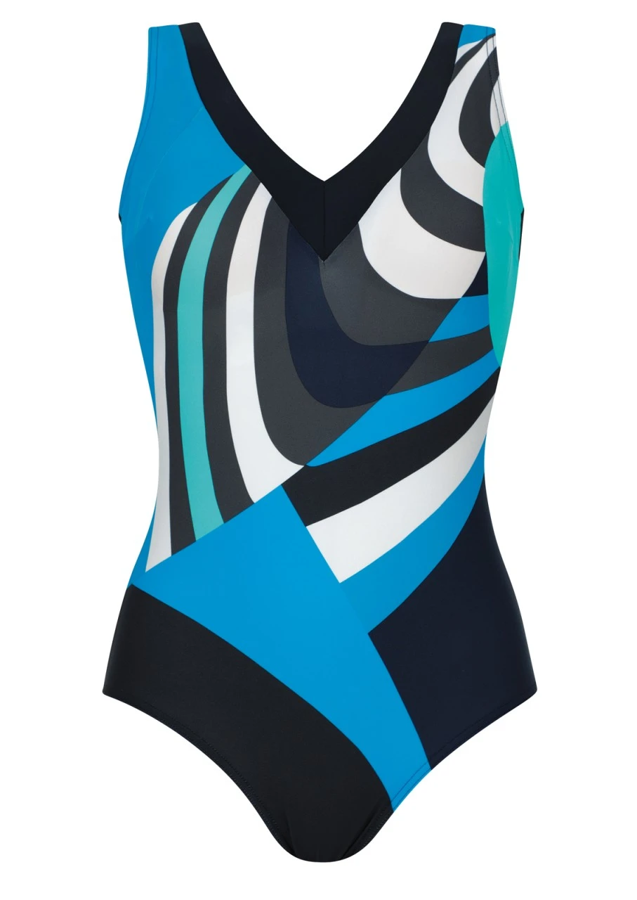 Frische und Sportlichkeit strahlt dieser Grafikprint in Blau, Weiß und Schwarz aus. Der Print macht Lust aufs erfrischende, kühle Nass. Badeanzug mit Softschalen. Die eingearbeitete Halbcorsage rückt Ihre Figur mit optimal stützender und formender Funktion ins rechte Licht. Die Unifarbene Blende am V-Ausschnitt streckt zudem optisch die Figur. Die Rückseite des Einteilers hat einen tiefen Rückenausschnitt und ist in der Farbe Nachtblau.