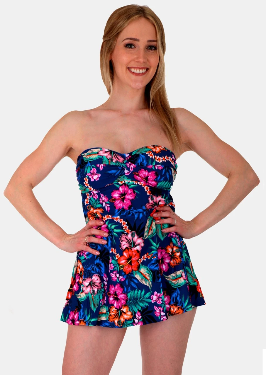 Aloha Hawaii! Herrlicher Print mit Blumen, Hibiskusblüten und Blätter in kräftigen Farben auf nachtblauem Grund. Ein Design so schön wie der Sommer. Badekleid im Bandeau-Schnitt mit Softschalen und Halbcorsage. Die Träger sind verstellbar und abnehmbar. Der hohe Rückenausschnitt rundet das Gesamtbild ab und gibt gleichzeitig Halt auch ohne Träger. Ein zauberhafter Badeanzug für alle, die es etwas dezenter mögen.