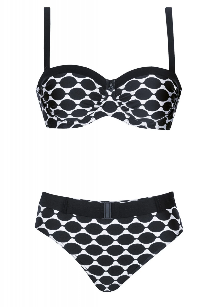 Schönes Retro-Design. Schwarze, verbundene Ovale auf weißem Hintergrund. Ein stylischer Vintage-Print. Bandeau-Bikini mit Softschalen und Formbügel. Die unifarbene Blende am Dekolleté und die verstellbaren sowie abnehmbaren Träger sind in der Farbe Schwarz. Der Taillienslip mit breiter Seitenhöhe ist mit einem Ziergürtel versehen, der den Look unterstreicht.