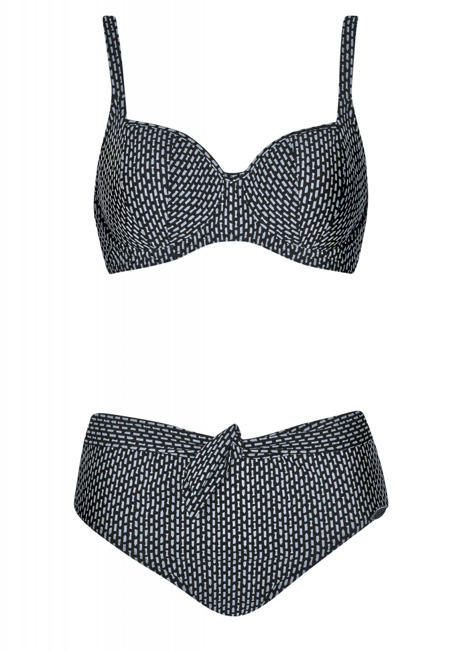 Wie von Hand gemalt: Kleines, feines Design in Schwarz/Weiß. Tiefschwarzer Untergrund, darauf senkrechte, kleine Striche in Weiß. Eine ganz besonders originelle Design-Idee. Bikini mit Spacer-Cup und Formbügel. Die Träger sind verstellbar. Tolles Highlight ist der Taillienslip mit extra breiter Seitenhöhe und Blende in Gürteloptik, die an der Vorderseite gebunden werden kann.