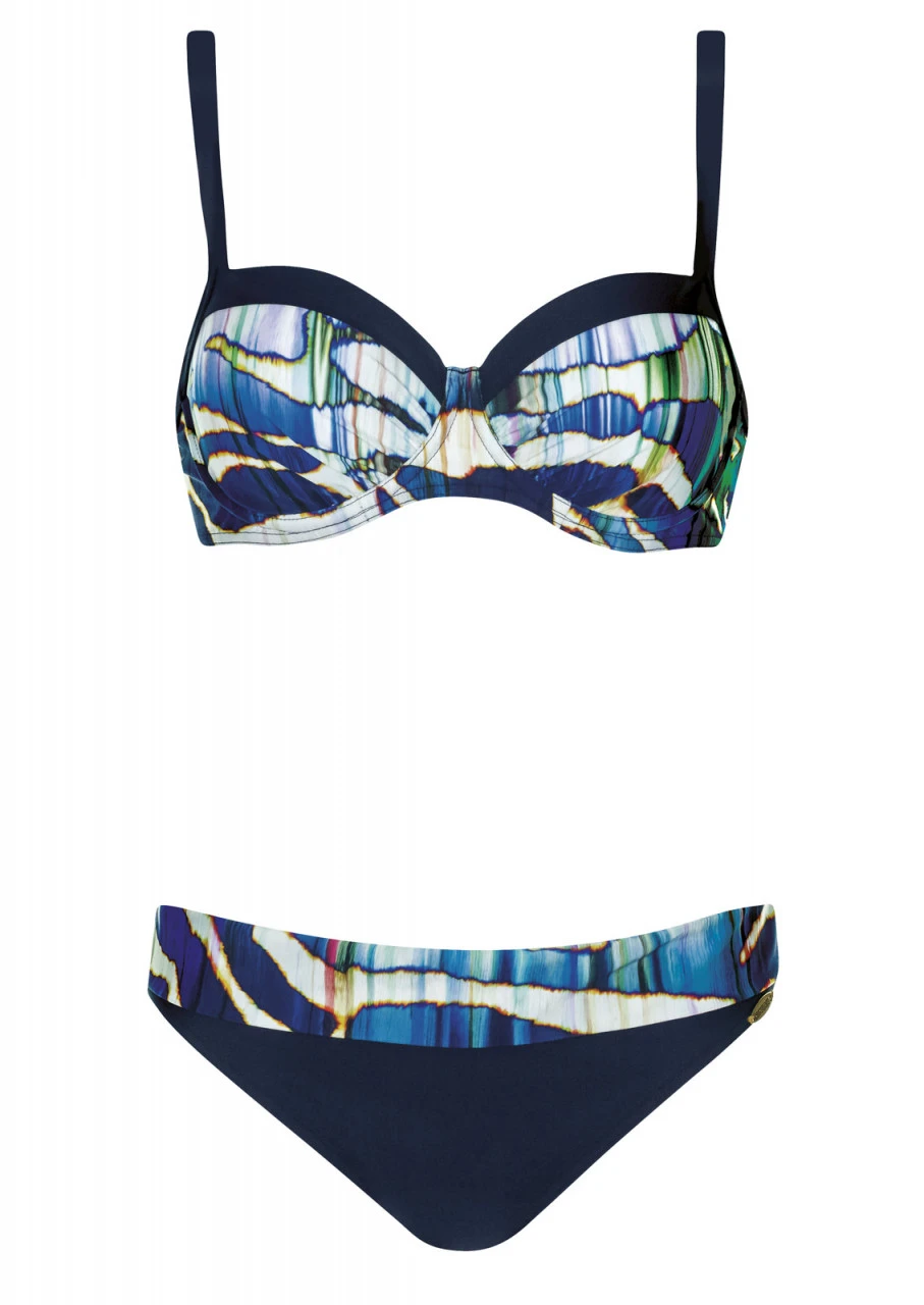 Ein sensationelles Design! Verwischtes Streifendesign in kräftigen Blautönen, Lila und Grün, darüber ein verwegener Animal-Print. Eine spektakuläre Kombination zweier Stile. Die unifarbene Blende am Top rundet das Design ab. Bikini mit Softschalen und Formbügel. Die Träger sind verstellbar und am Rücken zum Aushaken. Der besondere Clou ist die gemusterte Hosenblende am unifarbenen Slip. Nach Lust und Laune kann diese variabel getragen werden: entweder als sexy Slip oder nach oben geklappt, als bauchkaschierender Slip.