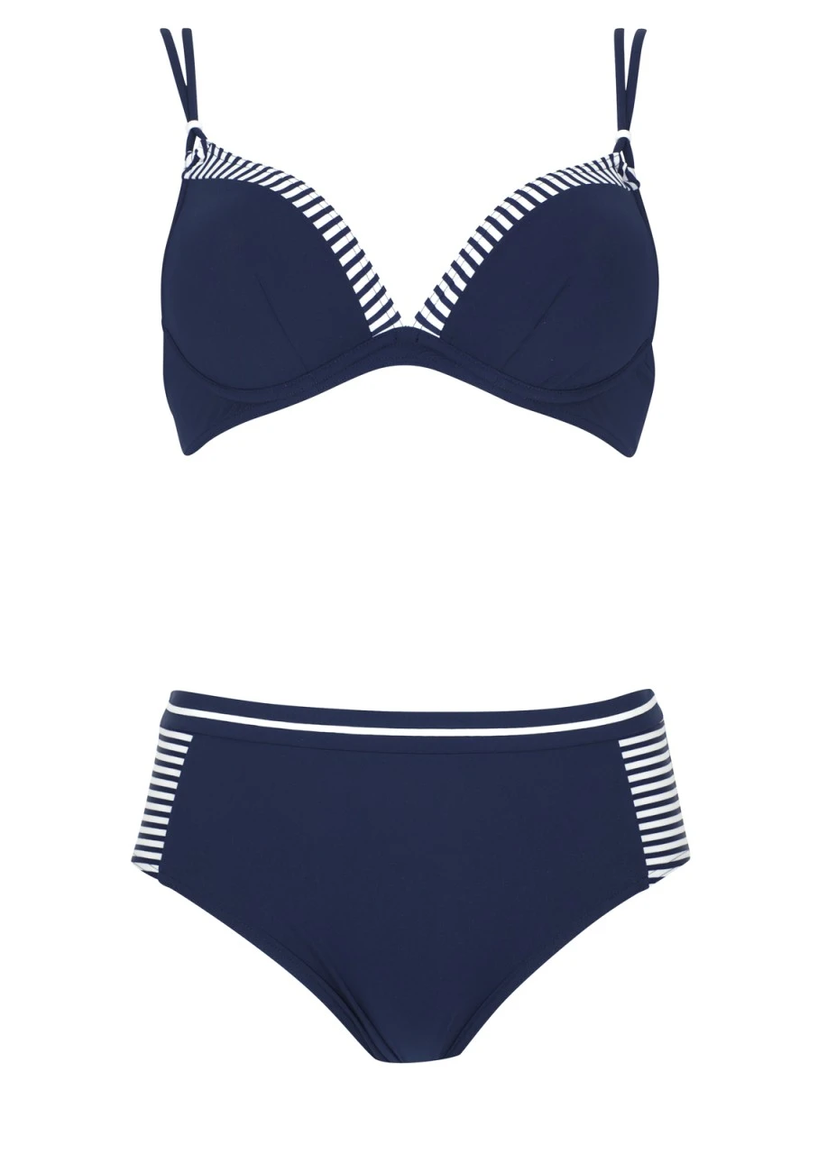 Klassisches maritimes Design in Blau, mit weiß-gestreiften Einsätzen. Für einen schicken Look und einen schönen Tag im und am Wasser. Schöner Bikini mit Formbügel. Die eingearbeitete Petticoatstütze formt und stützt sanft die Brust. Die doppelten Träger sind verstellbar und am Rücken zum Aushaken, dadurch können die Träger auch im Nacken gebunden werden. Schöner, breit geschnittener Taillienslip mit weißem Zierband am Bund und Streifen an der Seite.