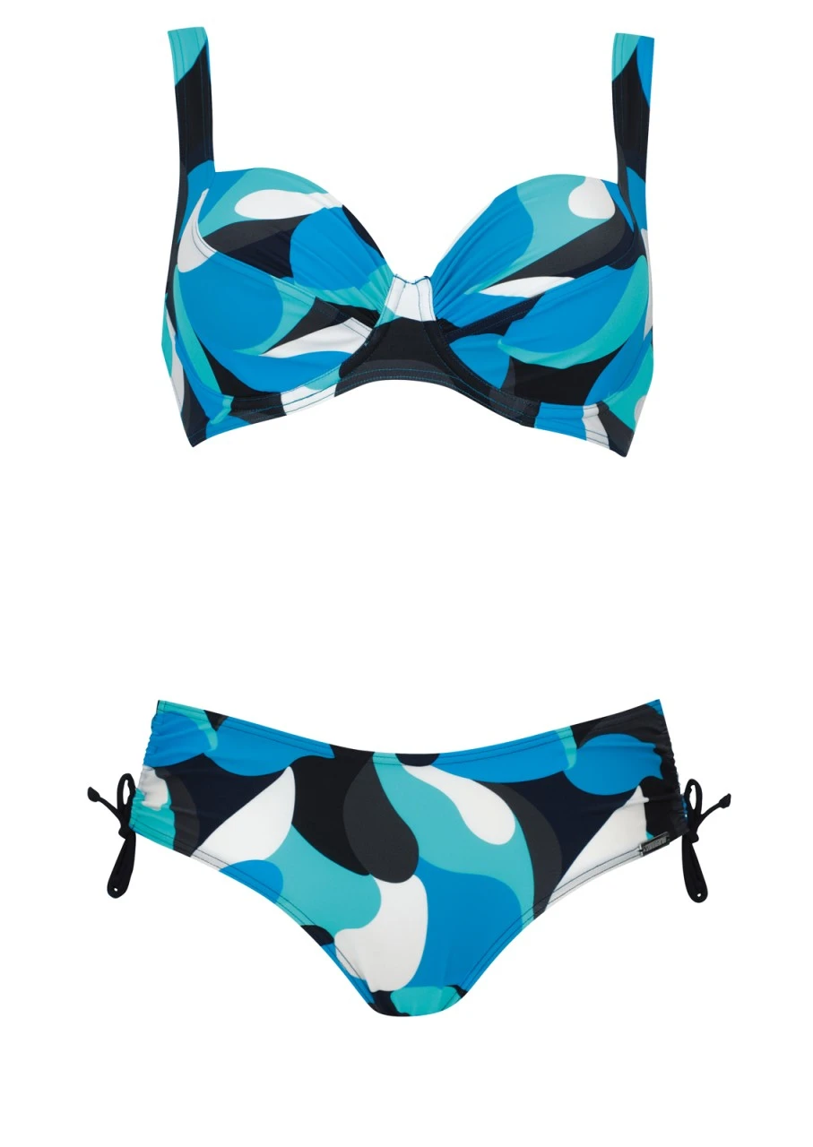 Frische und Sportlichkeit strahlt dieser Grafikprint in Blau, Weiß und Schwarz aus. Der Print macht Lust aufs erfrischende, kühle Nass. Bikini mit Formbügel. Die Träger sind passgenau in der Länge verstellbar. Verstellbare Bänder am Bikinislip sorgen für die gewünschte Höhe und den perfekten Sitz.