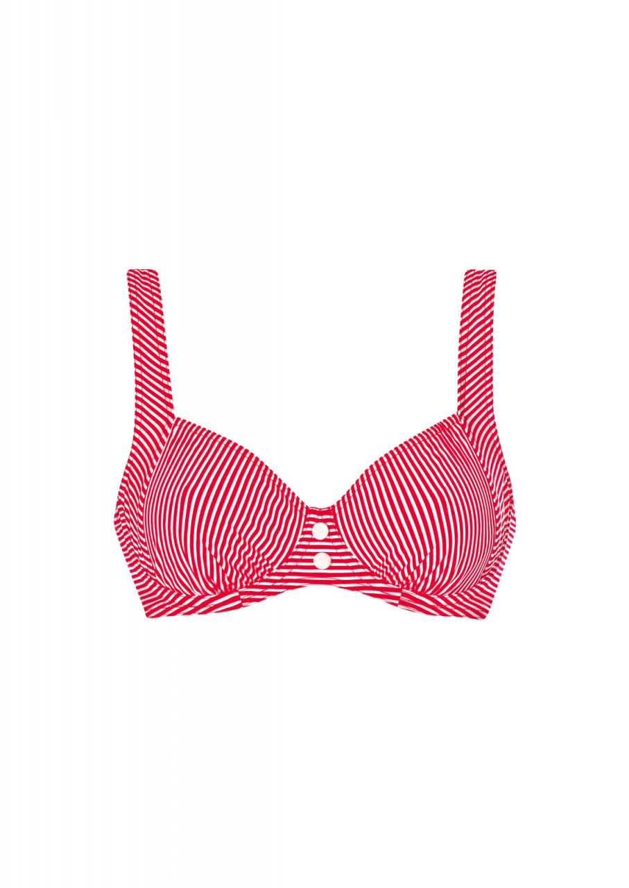 Schöne Längsstreifen. Frisches Streifen-Design in Rot/Weiß für trendige Bademode. Bikini-Top mit Formbügel und Petticoatstütze. Die breiten Träger sind verstellbar und an der Rückseite zum Aushaken. Schönes Detail: Zwei niedliche Zierknöpfe in Weiß zwischen den Cups. Nachhaltige Bademode: OLYMPIA® GOES NEXT LEVEL – Bademode aus recyceltem Material.