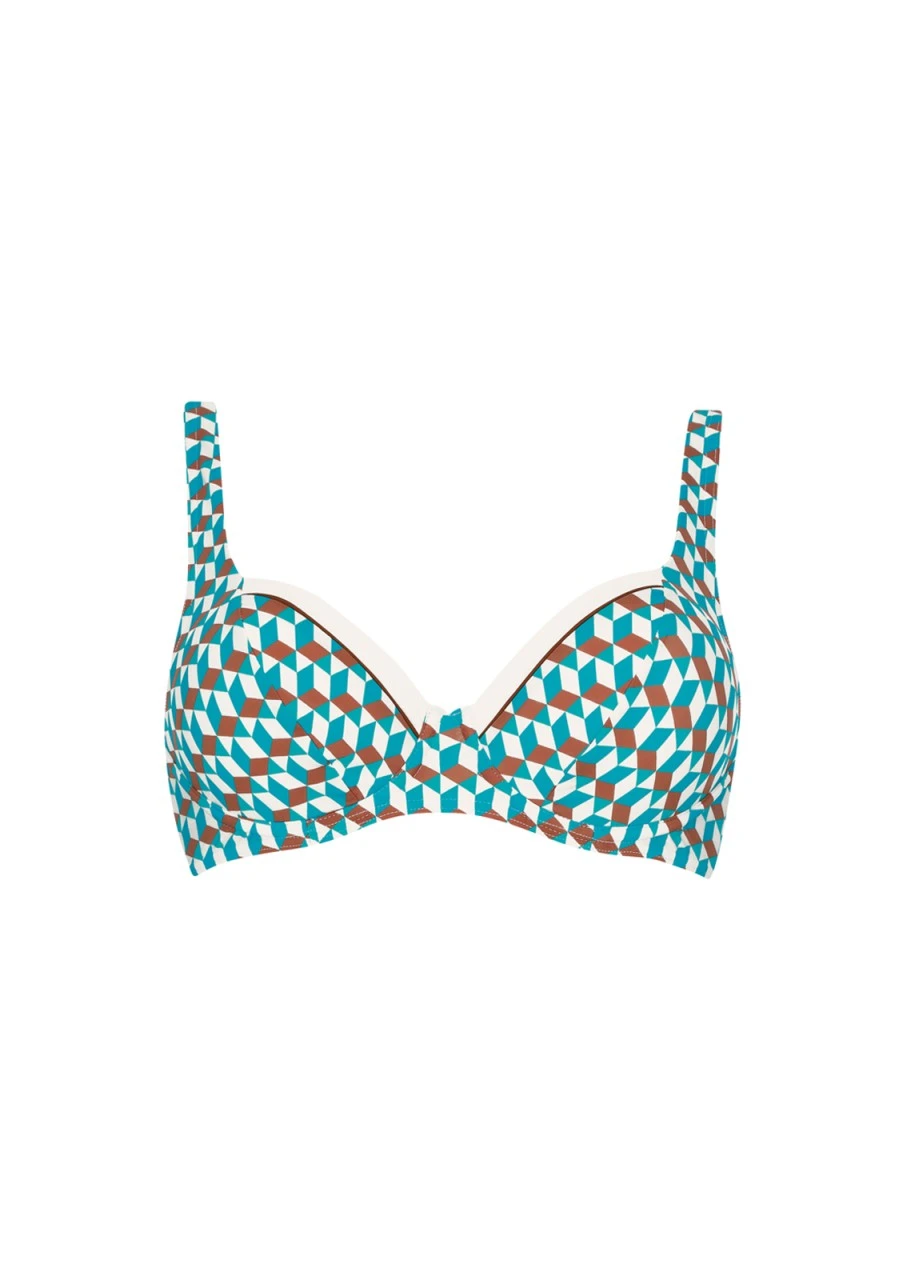 Wunderschönes Geometrie-Design im Retro-Look in den Farben Türkis, Cognac-Braun und Beige. Das Dessin ist nicht nur im, sondern auch außerhalb des Wassers ein toller Hingucker! Bikini Top mit Formbügel und Futterstütze. Die Träger sind passgenau in der Länge verstellbar. Unifarbene Blenden in Beige und Cognac-Braun zieren den Abschluss am Dekolleté und geben einen hinreißenden Kontrast zum Allover Print. Nachhaltige Bademode: Das Polyamid für den Oberstoff ist zu 100 % aus recycelten Fasern.