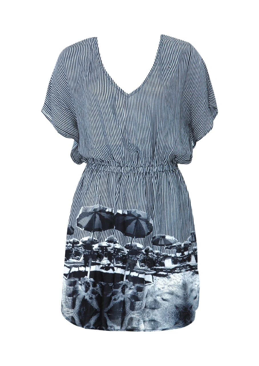 Ein Fotoprint mit Sonnenliegen und Sonnenschirmen am Strand trifft auf ein klassisches maritimes Design mit blau/weißen Streifen. Eine geniale Kombination! Luftiges Strandkleid mit Bindebändchen am V-Ausschnitt und zauberhaften Fledermaus-Ärmeln. Der Gummizug betont die Taille. Das Rockteil ist leicht ausgestellt, hat einen abgerundeten Saum und ist an den Seiten leicht geschlitzt. Das Mini-Kleid aus 100 % Modal ist angenehm weich und behaglich auf der Haut. Das Kleid ist bestens geeignet für einen Strandspaziergang, Strand- oder Beachbar – der nächste Urlaub kann kommen.