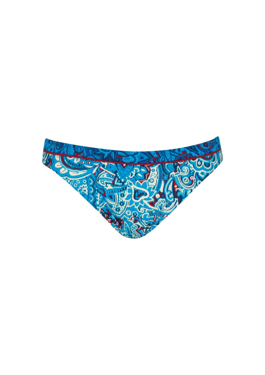 Lust auf süße Bademode? Wir empfehlen Ihnen dieses wunderschöne Paisley-Muster mit Farbmix. Eine schmale, rote Paspel trennt die beiden Stoffe – eine zauberhafte Kombination des modischen Prints auf weißem und türkisem Hintergrund. Süßer, schmal geschnittener Hipslip. Kombinieren Sie nach Herzenslust Ihren Style. Nachhaltige Bademode: OLYMPIA® GOES NEXT LEVEL – das Polyamid für den Oberstoff ist zu 100 % aus recycelten Fasern.