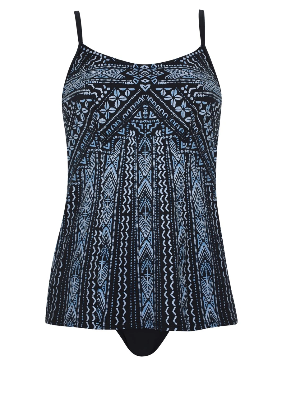 Kräftiges Nachtblau, darauf ein stylischer und zugleich lässiger Grafikprint in Hellblau. Ein trendiger Print für einen coolen Look im und am Wasser. Tankini mit Formbügel. Die Träger sind passgenau in der Länge zu verstellen. Der Taillienslip mit breiter Seitenhöhe in der Farbe Nachtblau vervollständigt den Zweiteiler. Nachhaltige Bademode: OLYMPIA® GOES NEXT LEVEL – das Polyamid für den Oberstoff ist zu 100 % aus recycelten Fasern.