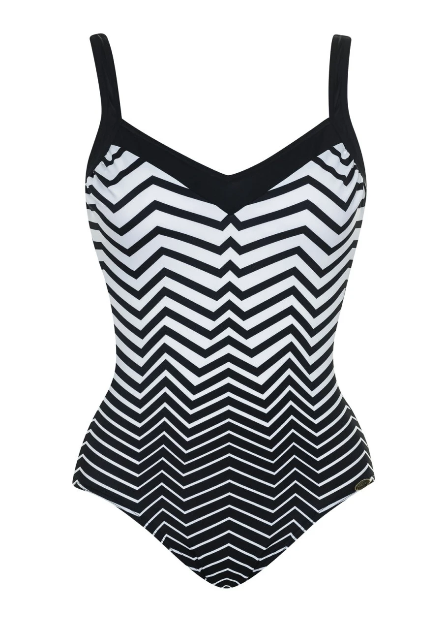 Schwarz-Weiß wechselt zu Weiß-Schwarz. Feine Zick-Zack-Linien zaubern eine faszinierende Optik. Dezentes Dekolleté durch angesetzte Blende. Badeanzug mit Softschalen und verstellbaren Trägern.