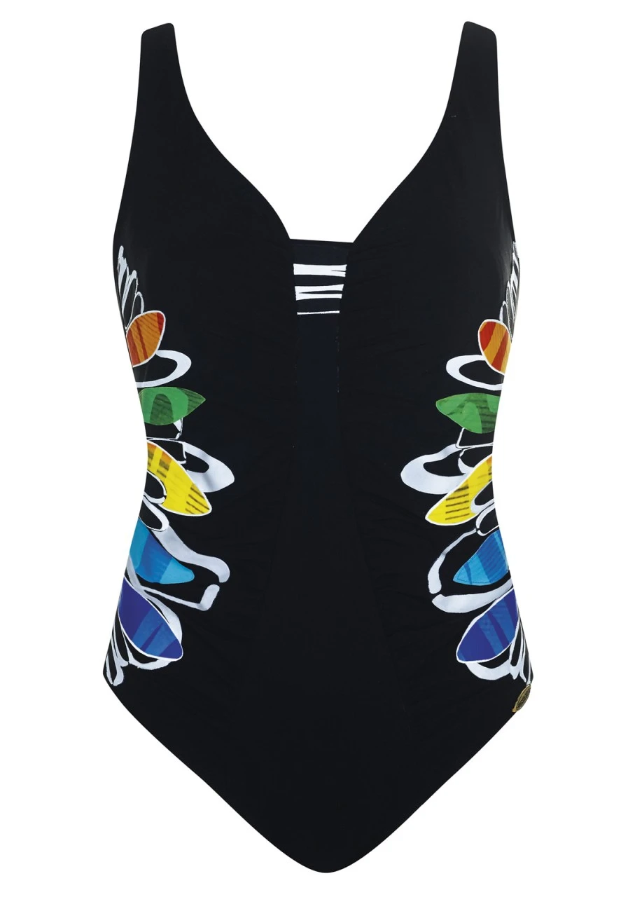 Feines Schwarz mit seitlichen, großen Blätterprints in frischen, kräftigen Farben. Macht dank des raffinierten Druckes und des Materials optisch schlank und passt zu jeder Frau. Shapewear- Badeanzug mit Softschalen und verstellbaren Trägern.