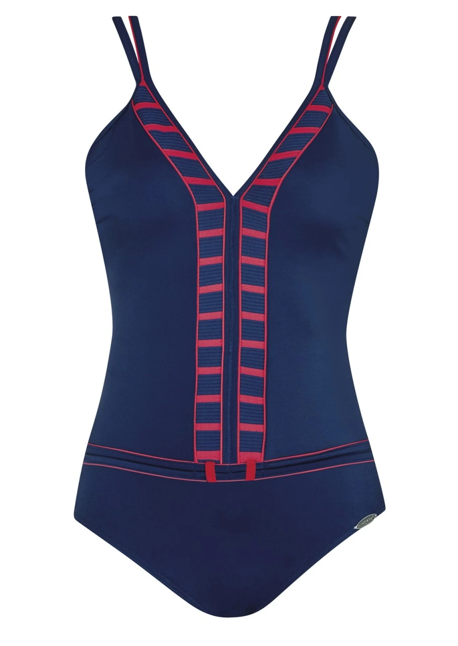 Marinelook neu interpretiert! Aufregendes Streifendesign in Nachtblau und Rot mit einer kräftigen, gerippten Struktur im Material, auf einem glatten, nachtblauen Untergrund. Somit ergibt sich eine unwiderstehliche Kombination zweier Materialen. Badeanzug mit Softschalen und einem tiefen Rückenausschnitt. Die doppelten Träger sind verstellbar.