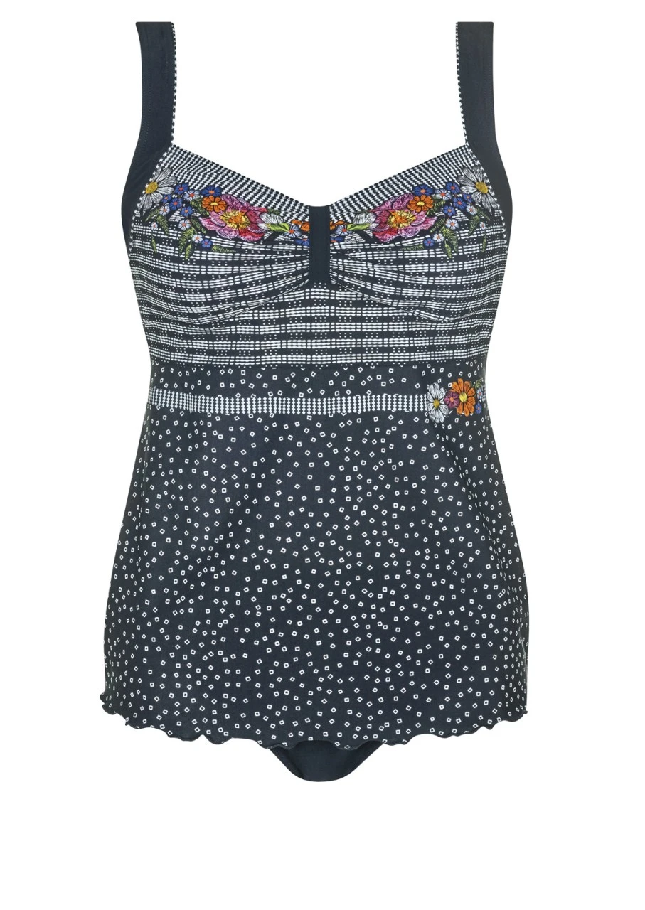 So lovely! Schwarzer Untergrund, darauf gewellte Linien und Streifen, Pünktchen und Quadrate in Weiß, kombiniert mit einem verspielten Blüten- und Blätterdruck. Tankini mit Softschalen. Die Träger sind verstellbar und am Rücken zum Aushaken. Taillienslip mit breiter Seitenhöhe in der Farbe Schwarz.
